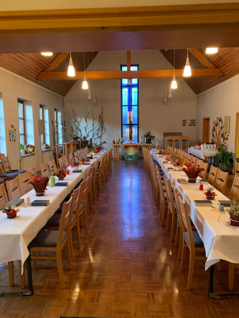 Sie sind herzlich eingeladen mit uns an langen, herbstlich geschmückten Tischen in der Kirche den Gottesdienst mit einem Agapemahl zu feiern, da wir auch anderen Glaubensgemeinschaften die Möglichkeit geben wollen daran teilzunehmen.